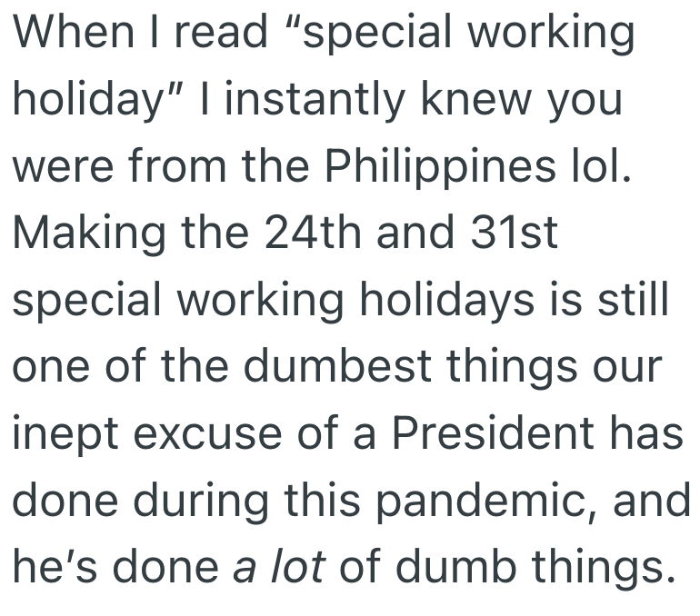 December 24 and 31 have always been non-working days in our country, but just this year our president announced that it will be a “special working holiday.”