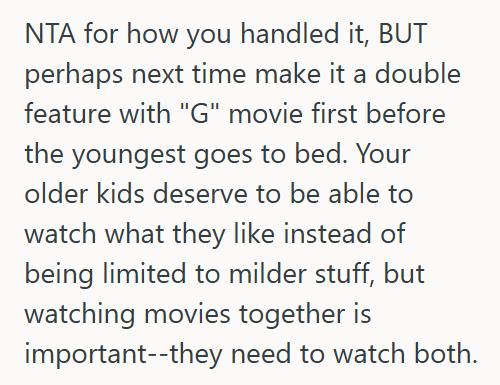He was not wrong. However, next time, I agree that the family should watch a kid-friendly movie first, so she doesn’t feel left out.