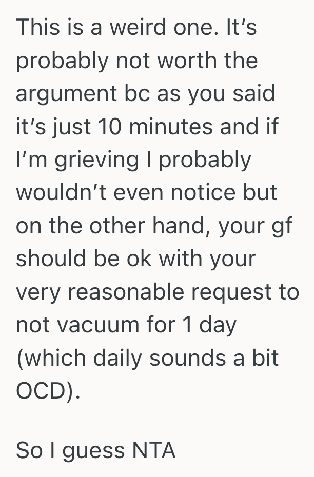 AITA for stopping my girlfriend from vacuuming when our downstairs neighbor’s mom just died?