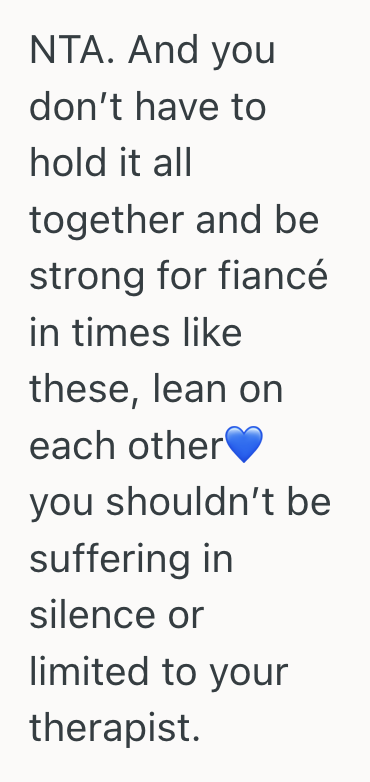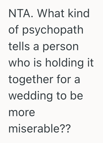 It’s really hard watching my mom do this to herself, which has been destroying me emotionally. I’ve been holding it together because I’m locked in for $40,000 on a wedding.