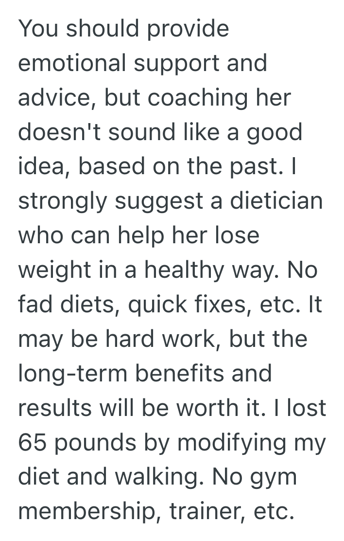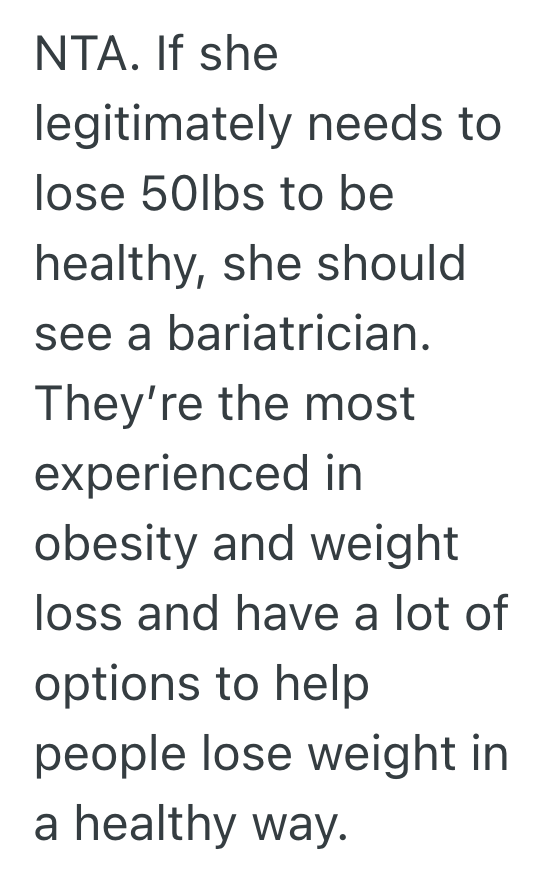 She wants me to help her lose, at least, 50 pounds for our wedding next year, and I said she should get a professional to help her.