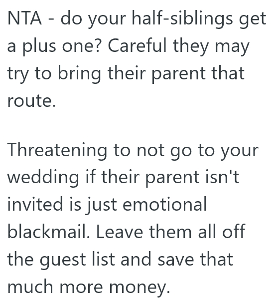 When I said my wedding is for us and our families and their exes are not part of it they pointed out my half siblings are and none will come without an invite to their other parent.