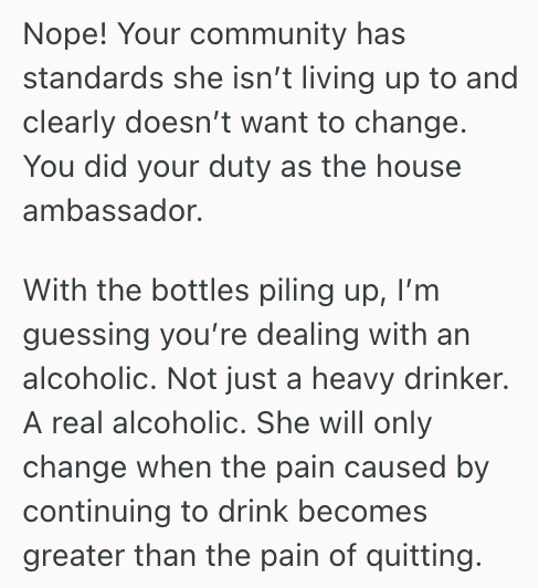 Her door kept having multiple empty wine bottles constantly build up, and we had to clean it because of the flies. She didn’t answer any of that either, and basically ghosted all communication.