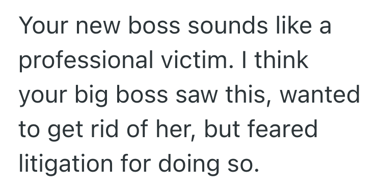 My union rep stayed in and I don’t know what was said but within 6 weeks my boss was gone and that same week my (weak and ineffective but likeable) big boss called me in to thank me as he had wanted to get rid of her but hadn’t known how.