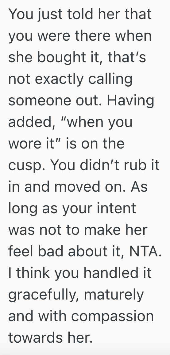 Calling out her friend didn’t seem to change the situation, so if her friend isn’t upset, it really doesn’t seem to matter. It’s just too bad her friend didn’t give her something more thoughtful than a ring too big for her to wear.