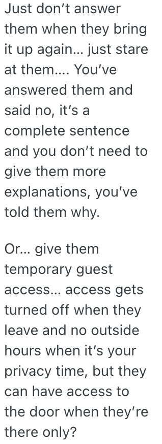 Since then she has asked me several times to give her access since she is at home with my daughter and “needs to know who’s at the door or if someone is trying to break in” and I’ve stood my ground on not giving her access again.