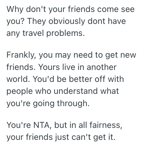 If her friends listened, they might understand her predicament – or she might feel like she has friends still, at least.