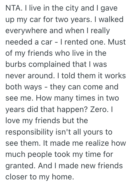 My friends have barely made the effort to come see me in two years without a car – they’ve visited four times. I live 40 minutes away.