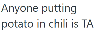 My husband says to my son: “Guess you won’t be eating chili that night, your aunt puts potatoes in her chili.”