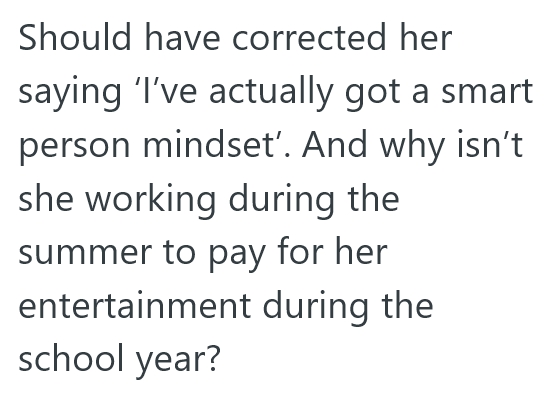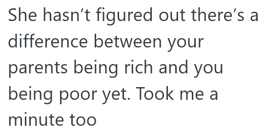 She goes to a private university, doesn’t pay for anything herself, goes out a lot with her friends, and it’s all funded by our parents.