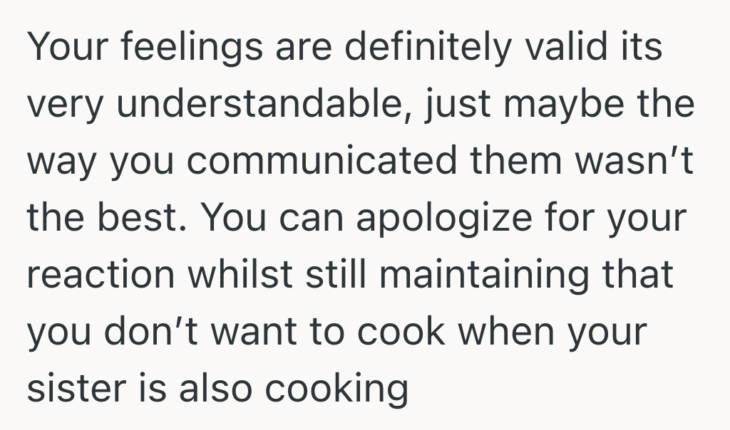 My sister and mom noticed that I was upset about cooking when someone cooked an alternative dinner for other people.