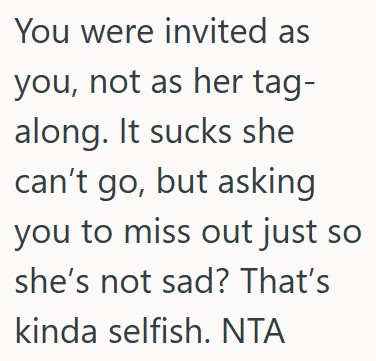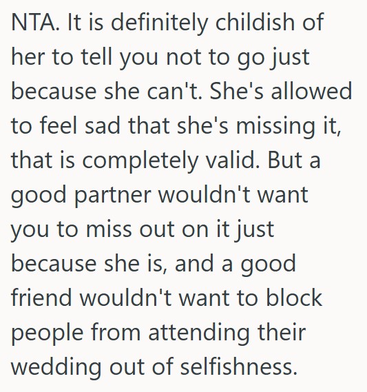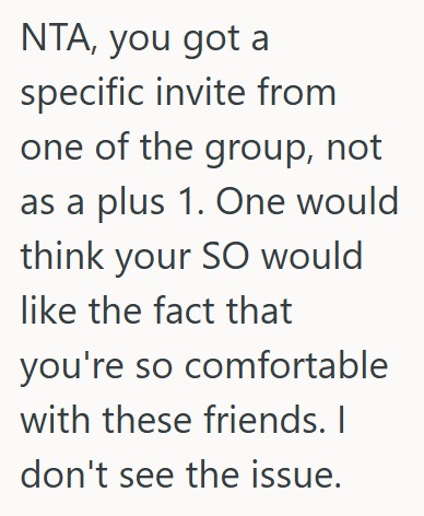 I really would love to go, but my SO doesn’t want me to. She says she’s already heartbroken that she has to miss it, and I’m being insensitive for wanting to go – they’re her friends, and she’d feel really sad if I’m there with them while she has to work. I told her I won’t go if she’s this upset about it, but in all honesty I don’t understand why, and I find the request unfair and somewhat childish – they’re my friends now too, and I was even specifically told that I’m not just her +1.