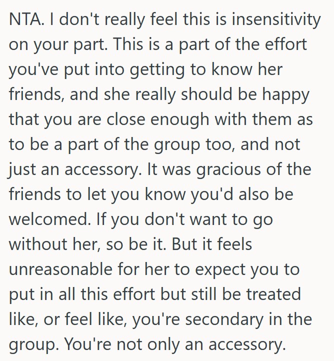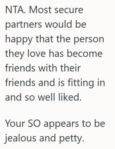 If anything, she should be happy that her boyfriend has developed a good friendship with her friend group.