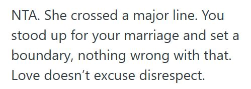 She was against our marriage, and she doesn’t respect her or my marriage because she either ignores my wife completely or taunts her.