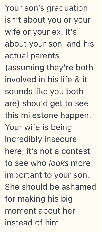 Now my wife is mad at me, and accused me of just wanting to see my ex. I do want my wife to come to the graduation, but I think that it’s more important that my son has his mom there.