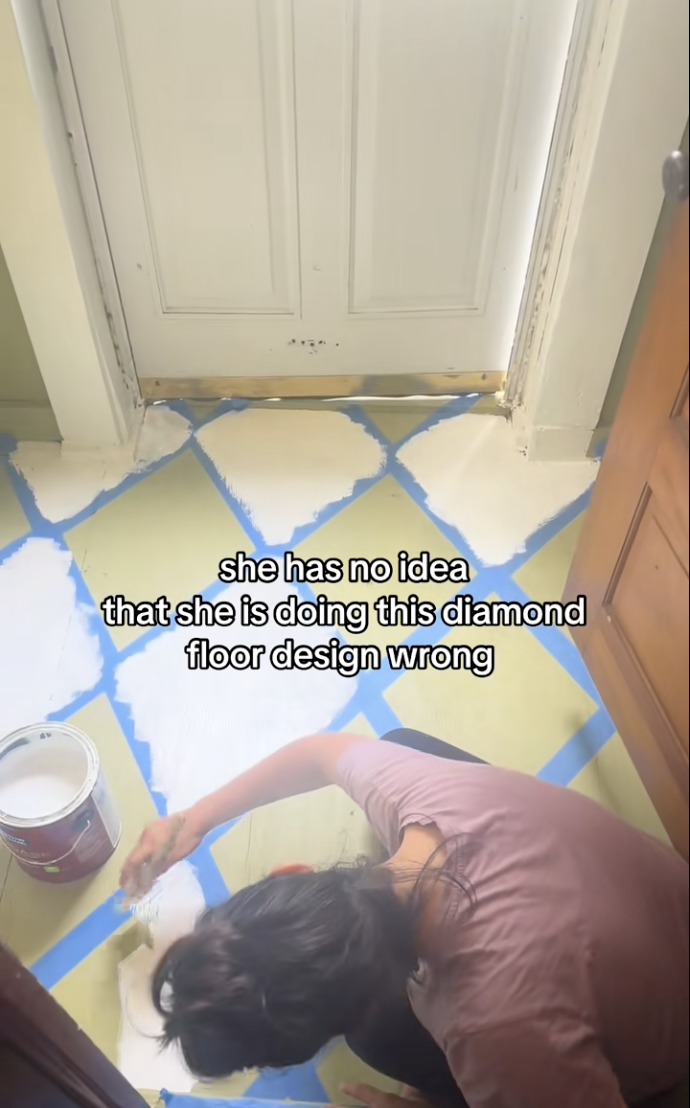 In the clip, she’s taping off a diamond pattern on an entryway floor, and then proceeding with green and white paint.