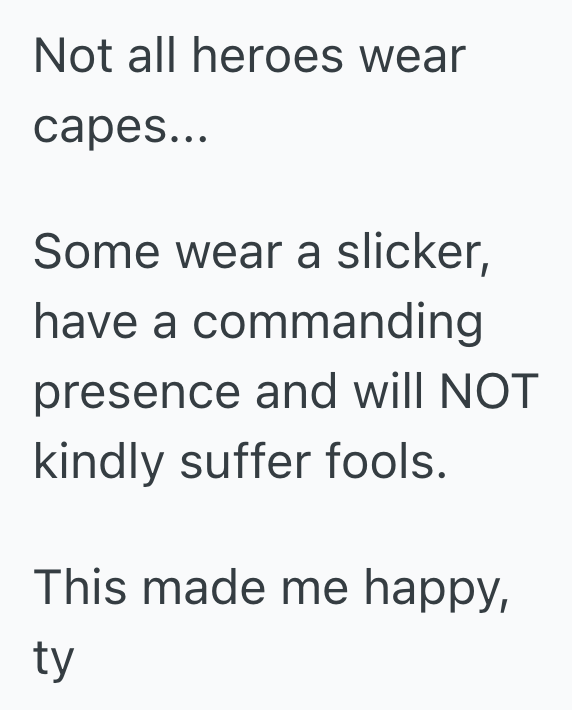 That is until my dad, a very fit, 6’ 2” guy wearing his safety rain gear approached his window and said “Look, I’m trying to help this lady so she can move her car, but if you want to go help her put gas in her car, I’ll gladly sit here and honk your horn for you” 😊