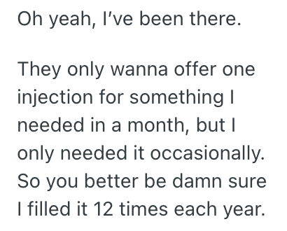 The insurance company’s rules don’t make sense, but it’s great that the pharmacist helped OP find a way to get the pills and the spray.
