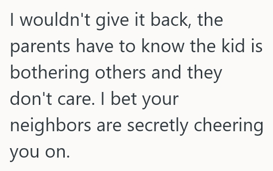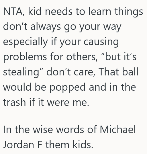 Confronting the kid’s parents about the situation would be a better way to handle it than stealing the kid’s ball. Eventually, he’ll probably get another one.