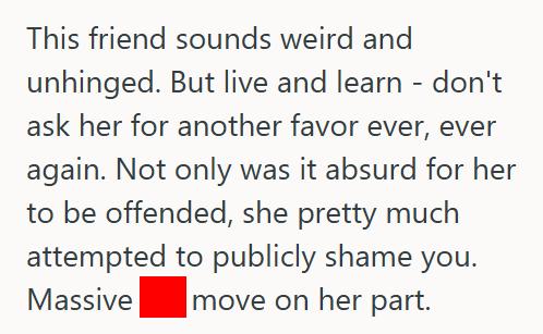 She needs to rethink this friendship, or at the very least, never ask her for anything ever again.