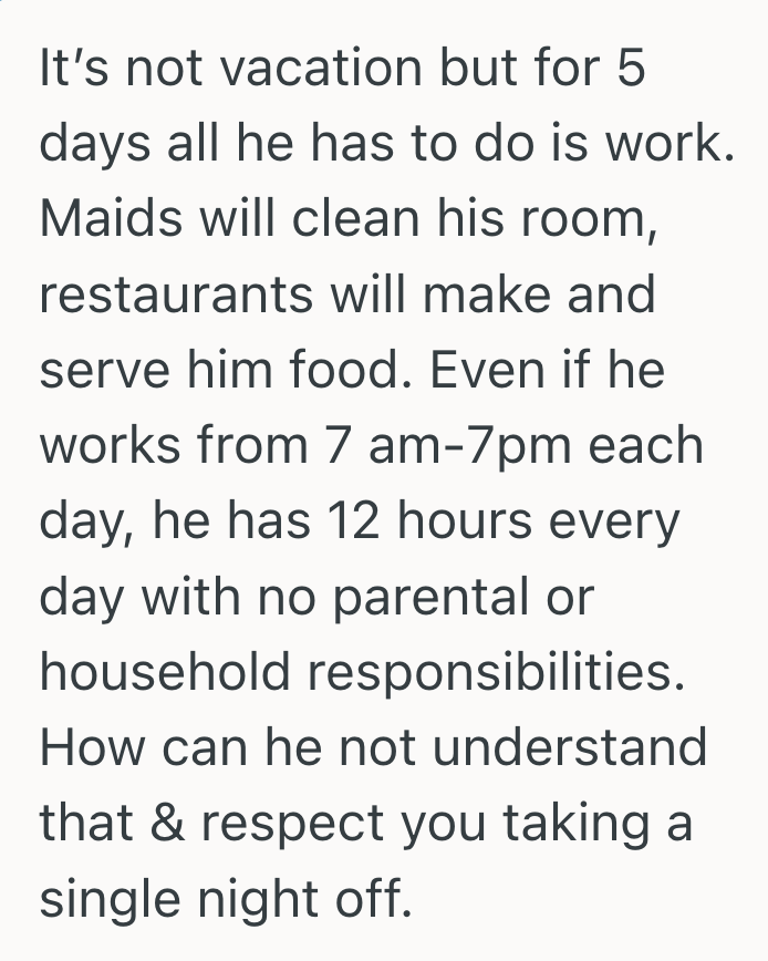 I never said it’s a vacation. But working full-time here and managing two kids while your spouse is out of town is a lot. I’m already stretched thin with my own work, the kids, and my mom’s estate, and I’m exhausted.