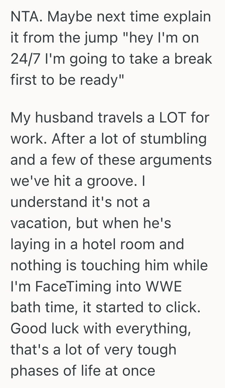Tags: · aita, alone time, couples arguing, losing a loved one, picture, reddit, SAHM, self-care, stay at home mom, stressful situations, top, vacations