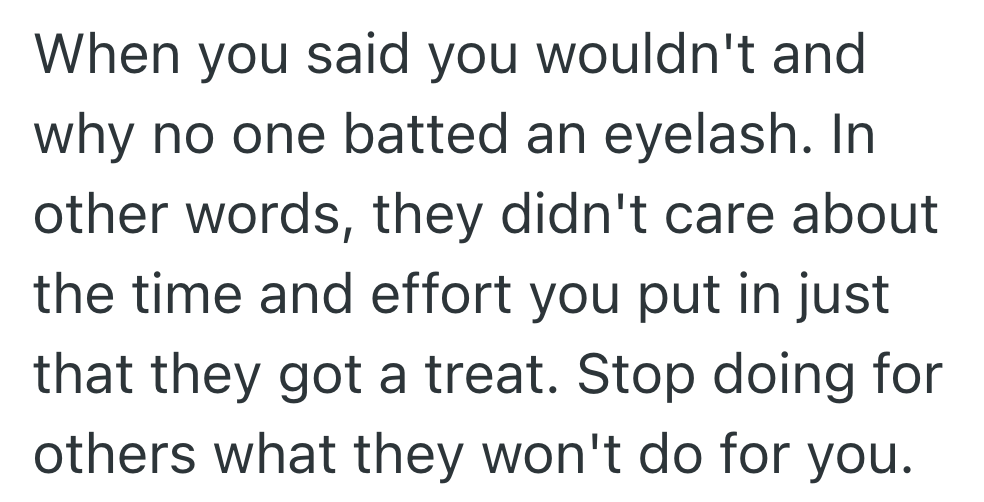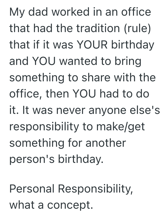 I was pretty hurt, but let it go and told myself that I wouldn’t be making any effort for anymore birthdays unless specifically told to by my boss.
