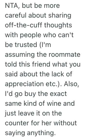 About 30 minutes later, she sent her roommate a message about the wine, saying that it was annoying to come home and see her stuff used and that it was being saved for her graduation party, which was all very reasonable.