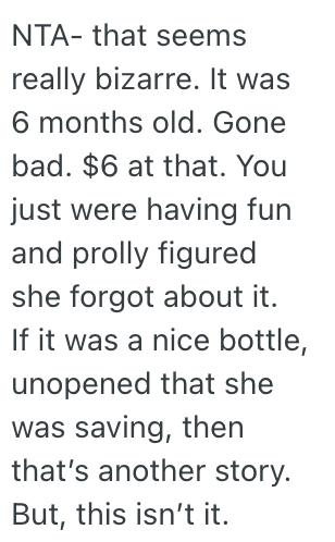 At the time I opened the bottle, there were literally no thoughts in my head, period. I was tipsy and just assumed it was leftover. I didn’t even consider that she might have considered it hers or a gift.