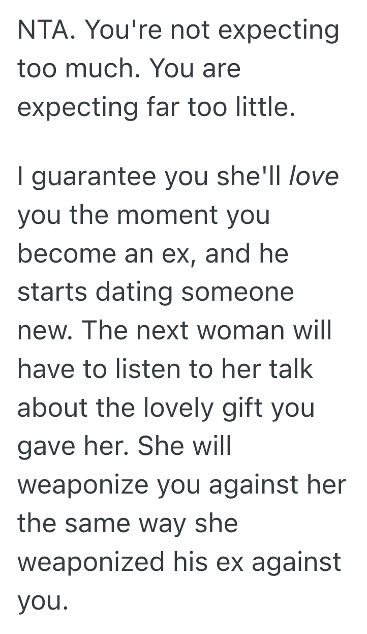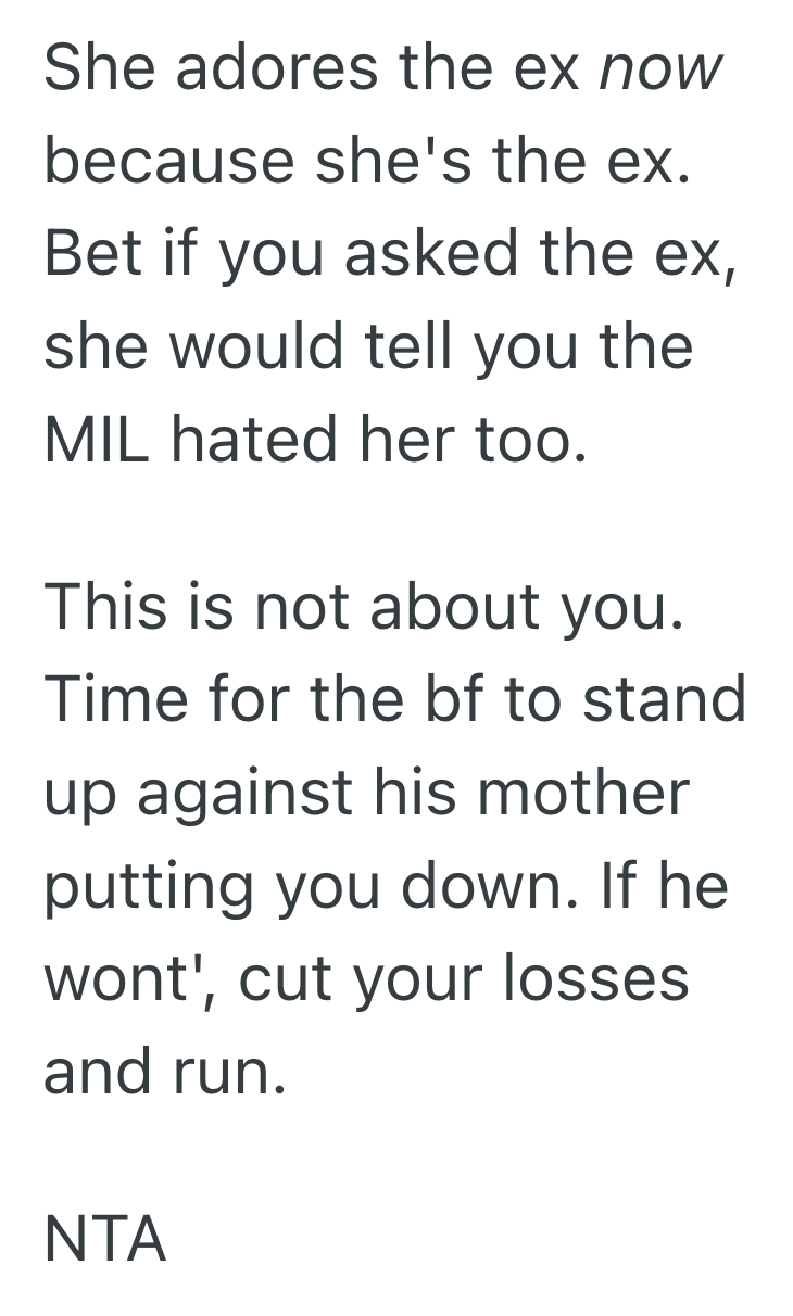 She constantly compares me to his ex, who she clearly adored. The ex cheated on him, btw.