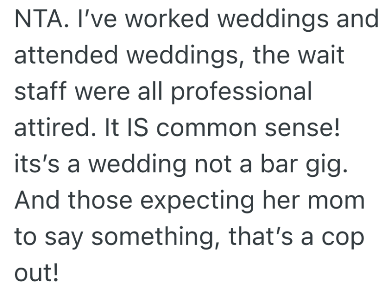 She asked what was wrong with her top and I told her it was very cute, but I personally would not have worn that to serve a wedding.