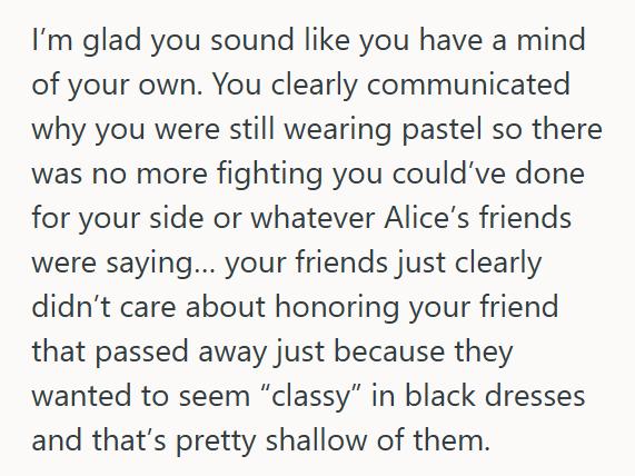 I told them I still intended to wear the original pastel dress because (1) it was already purchased, and (2) I wanted to wear the dress for our friend. I told them it wasn’t for attention or effect — just that it was something important to me.