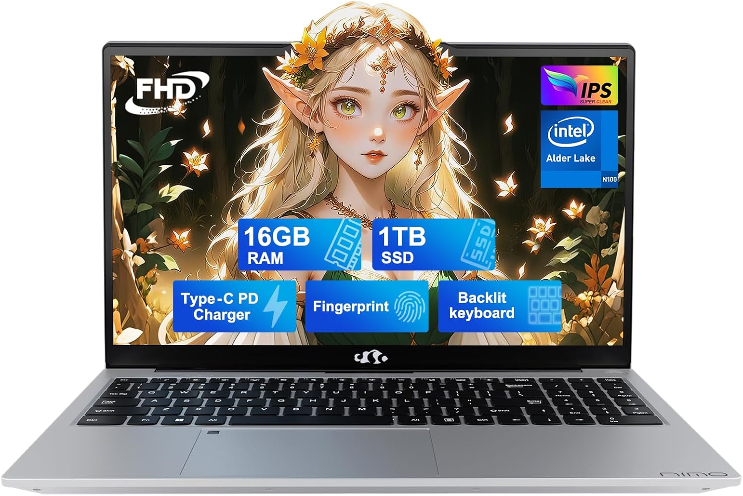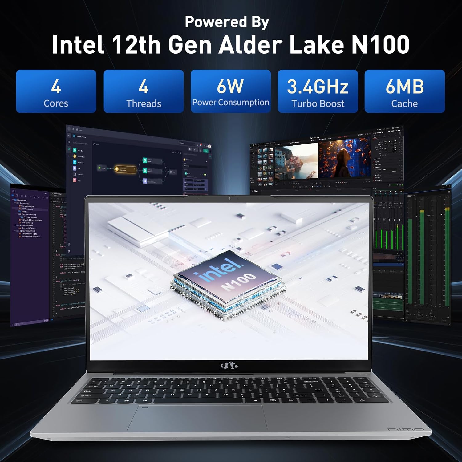 The Nimo N151 Windows 11 Laptop is a 15.6-inch laptop with one terabyte of SSD storage, 16 gigs of DDR4 RAM, an Intel N100 processor, and Windows 11 Home Edition.