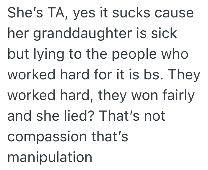 So here’s my question: Even though the granddaughter is sick, is it okay to take away the reward someone else worked hard for — just to help a relative?