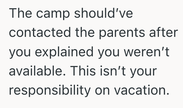 Then last night the dad started texting me furious that I dismissed his “injury,” reminded me about his (extremely mild) mosquito allergy (The counselor already said someone at camp gave him his Zyrtec so he’s absolutely fine), and thinks I should’ve contacted him, his mom, or asked the kids mom to get him after the camp called me.