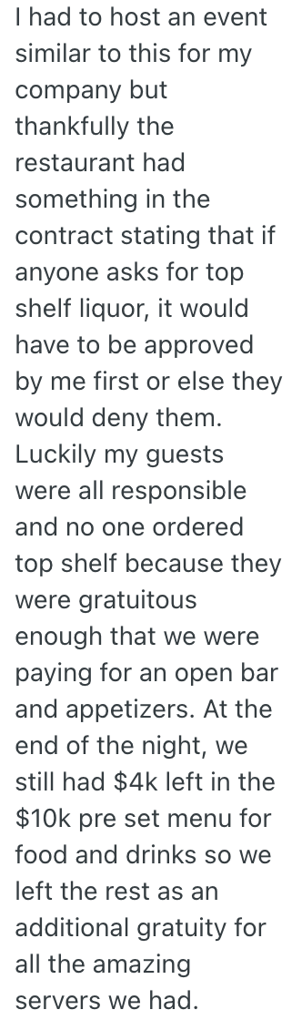Surprisingly, most of the table was normal, not entitled people and who knew that waiters are people too. They were impressed by the food, and graciously ordered the drinks that were in the contract.