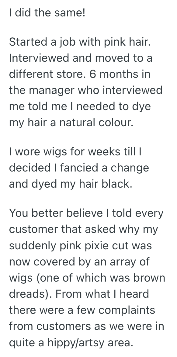 He’d seen the survey, and his response was an ultimatum to dye my hair back to a “normal” color by end of week or face repercussions.