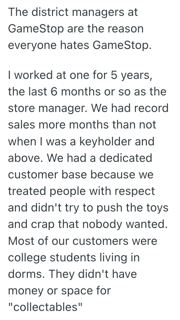 The next day, my district manager is in (he rarely stopped by, maybe once every two months) and pulled me aside for a chat.
