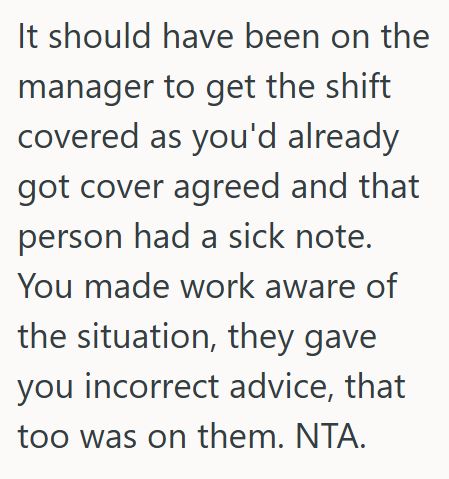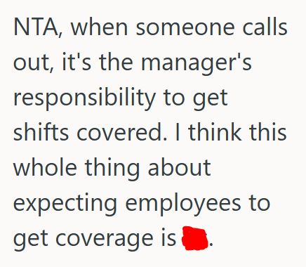 However, this morning my general manager Kathy calls me and says Julia is out sick. She says its my responsibility to either get that shift cover or come in. It wasn’t Julia’s responsibility because she had a doctors note.