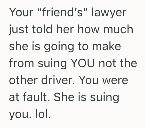 Her friend wanted to sue the other driver for an easy payout, but she told her not to because it could backfire on them.