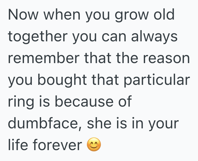 She never talked about her ring again and would visibly scowl whenever she saw Sweetieface’s ring.