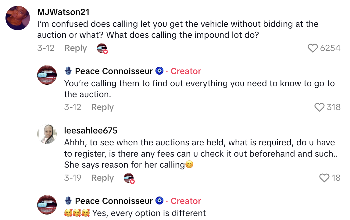 The TikTokker told viewers, “Look for impound lots in your area. Call them and ask them: When is the auction? What is required? Is there a fee? Can you go prior to go check on the cars? Because, obviously, you want to take a mechanic.”