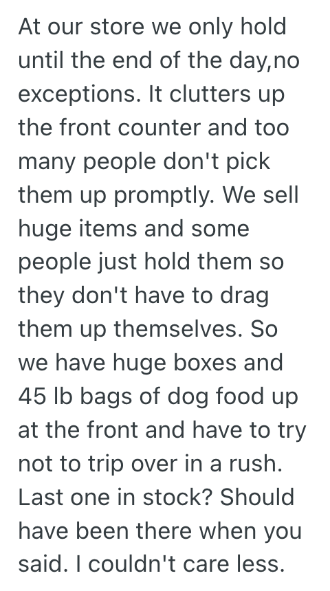 When one customer failed to pick up a held item in a timely manner, they learned the hard way that “we’ll hold it for you” doesn’t mean “we’ll wait forever.”