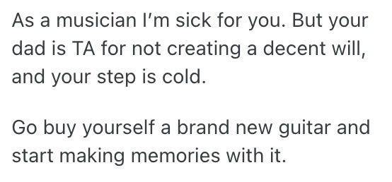 But after the funeral, when I gently asked my stepmom if I could have the guitar, she told me, “No, I’m saving it for our son. It was his father’s guitar, and he deserves to have something of his dad’s.”