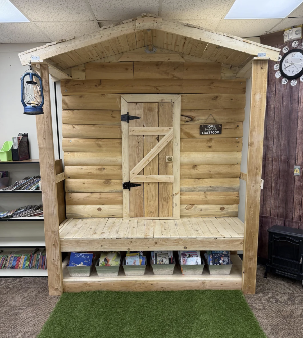 – Teacher’s themed classroom has a cabin porch