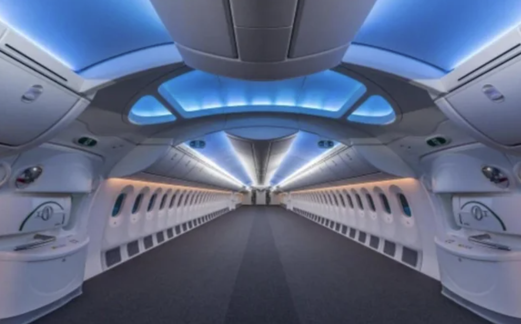 Interior of a Boeing 787 Dreamliner airplane before seats